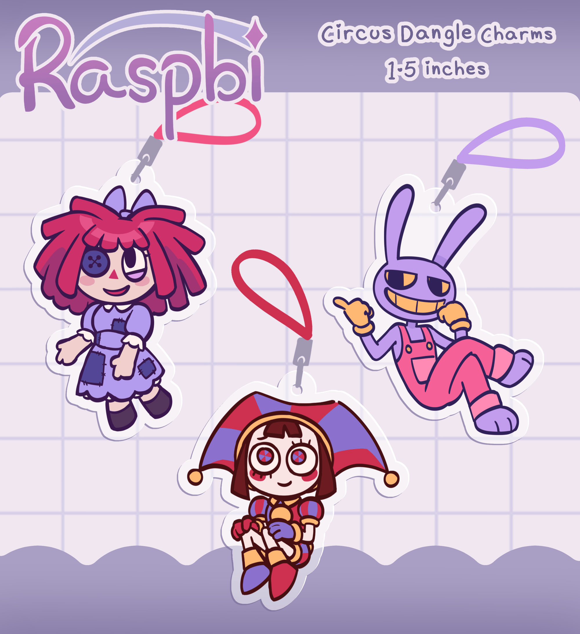 1-1.5 inch charms of TADC characters! Comes on a strap to attach to a phone or whatever else you like.